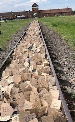 Des rails d’entrée au camps d’extermination d’Auschwitz-Birkenau recouverts de messages rappelant le pogrom perpétré dans le sud d’Israël le 7 octobre 2023, par les terroristes du Hamas.