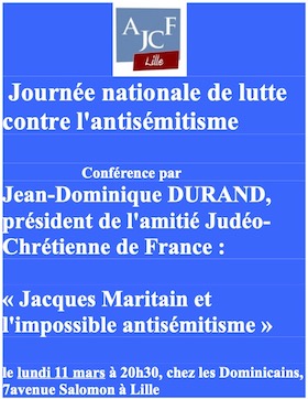 Dans le cadre de la 3ème Journée Nationale de lutte contre l’antisémitisme, l’AJCF Lille reçoit Jean-Dominique Durand président de l’AJCF pour une conférence sur Jacques Maritain et l’impossible antisémitisme lundi 11 mars à 20H30 chez les Dominicains, 7 avenue Salomon à Lille.