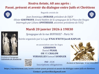 Le 20 janvier 2026, à 19H30, à la synagogue de la rue BUFFAULT, Jean Dominique DURAND, président de l’AJCF et Olivier KAUFMANN, Grand Rabbin de la synagogue de la Place des Vosges et Directeur du séminaire israélite seront questionnés par Liliane APOTHEKER, ancienne présidente de l’ICCJ et membre du comité d’honneur de l’AJCF et présenteront leurs regards croisés sur l’évolution du dialogue entre juifs et chrétiens depuis la déclaration conciliaire de Vatican II, votée le 28 octobre 1965, 2 ans après la mort de Jules ISAAC