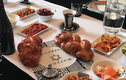 Le menu comprend un assortiment de petites entrées, un plat principal* et son accompagnement, un dessert, la traditionnelle Halla (pain tressé) et les boissons (eau, vin).