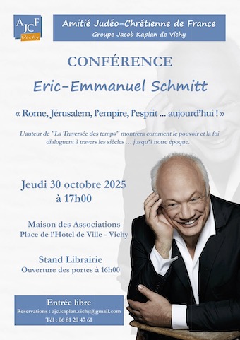 Accueil > Groupes locaux AJCF > Auvergne Rhône-Alpes > Vichy > Rome, Jérusalem, l’empire, l’esprit...aujourdhui-Conférence de Eric-Emmanuel Schmitt